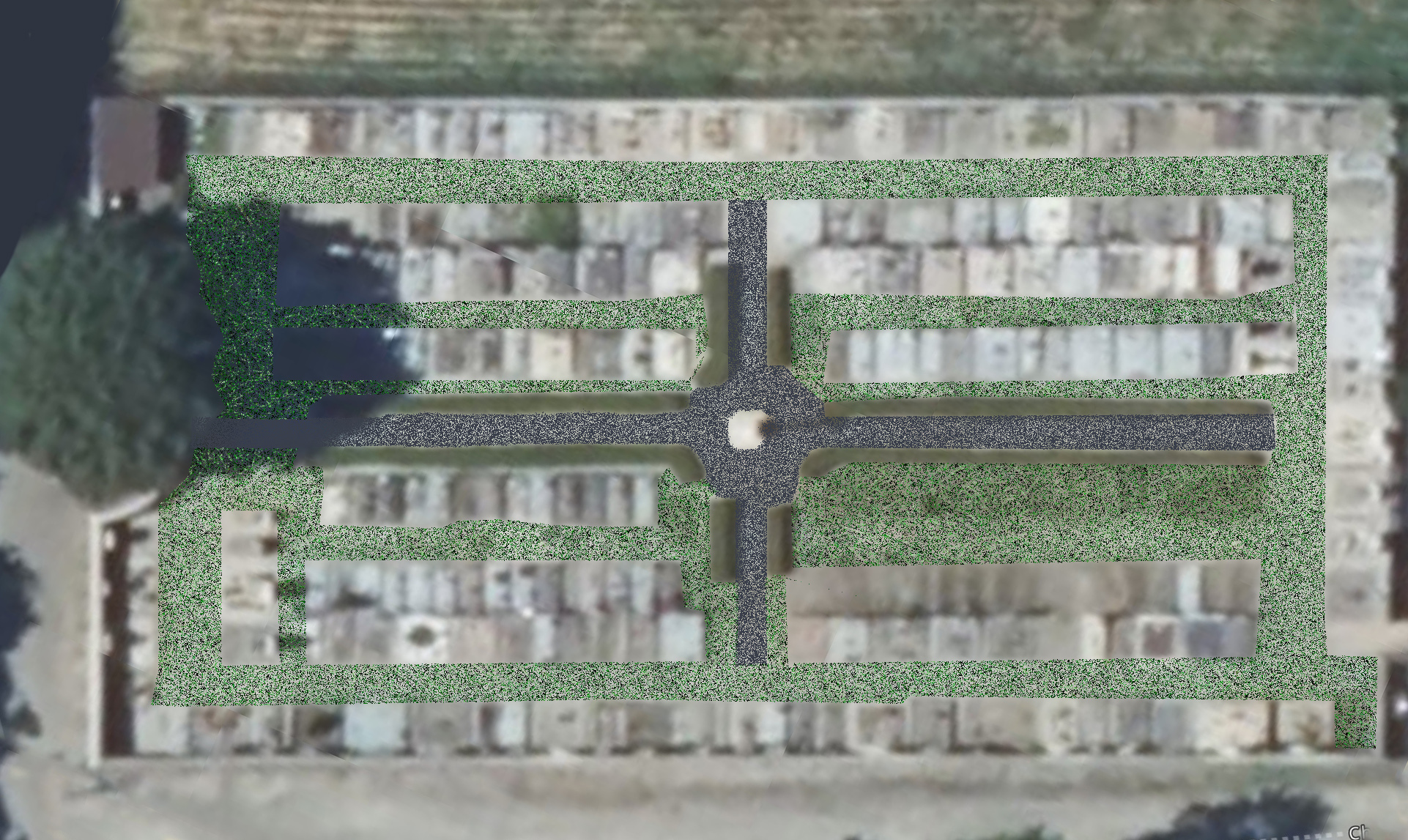 Lors de la séance du conseil municipal du 6 mai 2025, une délibération a été prise concernant la configuration de la partie de l’ancien cimetière. Suite à une présentation de différentes solutions proposées par le cabinet Ellipse, l’option de tout enherber sauf les allées centrales (partie grisée sur la simulation ci-dessous) formant une croix, a été retenue.