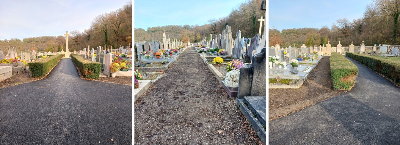 Après la mise en place du revêtement drainant de l’allée centrale au mois de septembre, c’est l’ensemble des autres allées de l’ancien cimetière qui a été aménagé au début de ce mois de novembre (après la Toussaint).